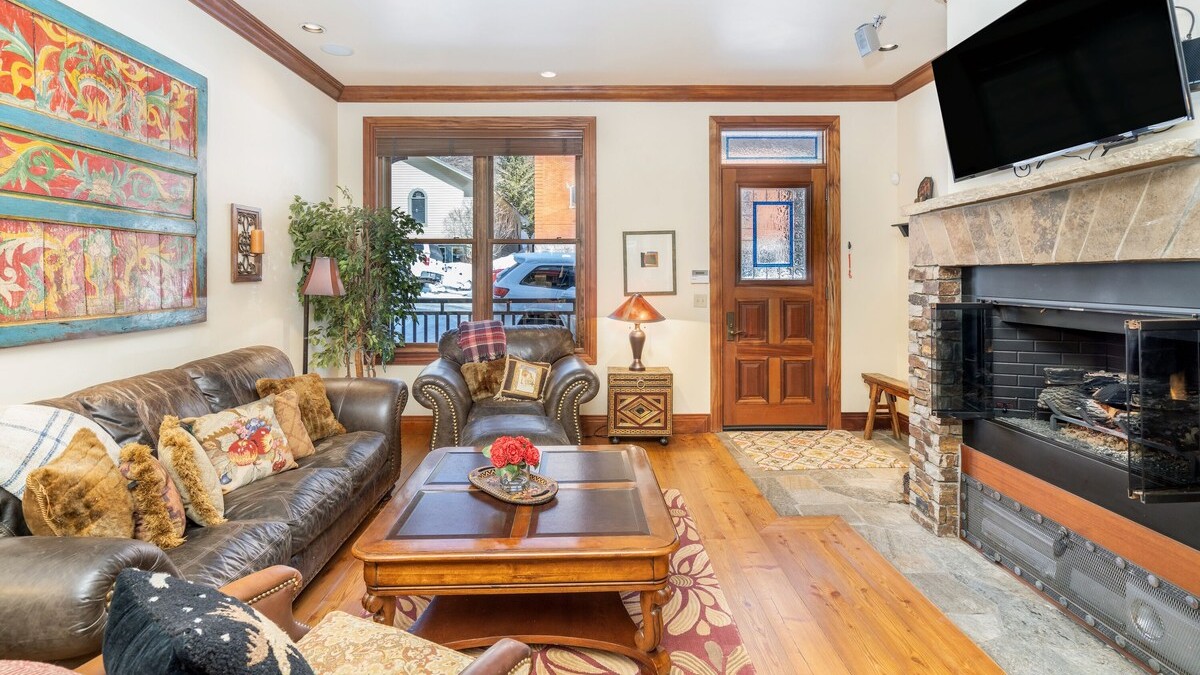 Enter into the Telluride residence from a private front porch into a main living room, authentically designed with a charming and cozy aesthetic. A native stone fireplace provides warmth and ambiance while the south-facing windows draw in the Colorado sunshine. Adjoining the open space to the kitchen is an intimate dining space with seating for eight. The mountain kitchen features granite countertops and updated appliances.